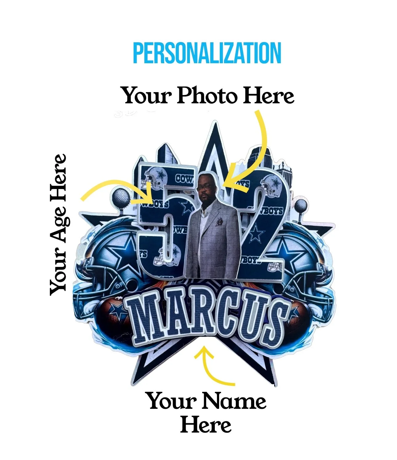 READY TO USE CAKE TOPPER. Please provide 1.) Name & 2.) AGE of Birthday Recipient in personalization section provided. See photo instructions below.